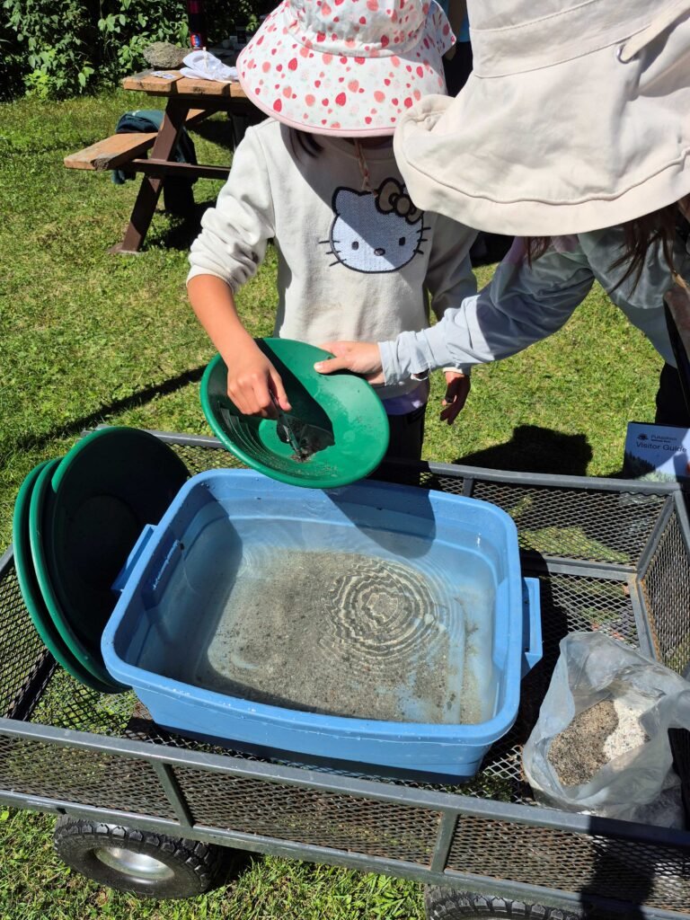 Drop-In Session near Visitor Centre, showing table with rock and mineral samples, books and maps, as well as a gold panning station
