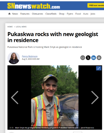From August 11-24, 2025 I had the pleasure of serving as the Canadian Federation of Earth Sciences (CFES) and Parks Canada’s fourth Geologist-in-Residence (GIR) at Pukaskwa National Park. I worked closely with Carly Robillard, Pukaskwa’s Interpretation Officer and Coordinator to deliver geology-based educational experiences to Park visitors and Parks Canada staff.